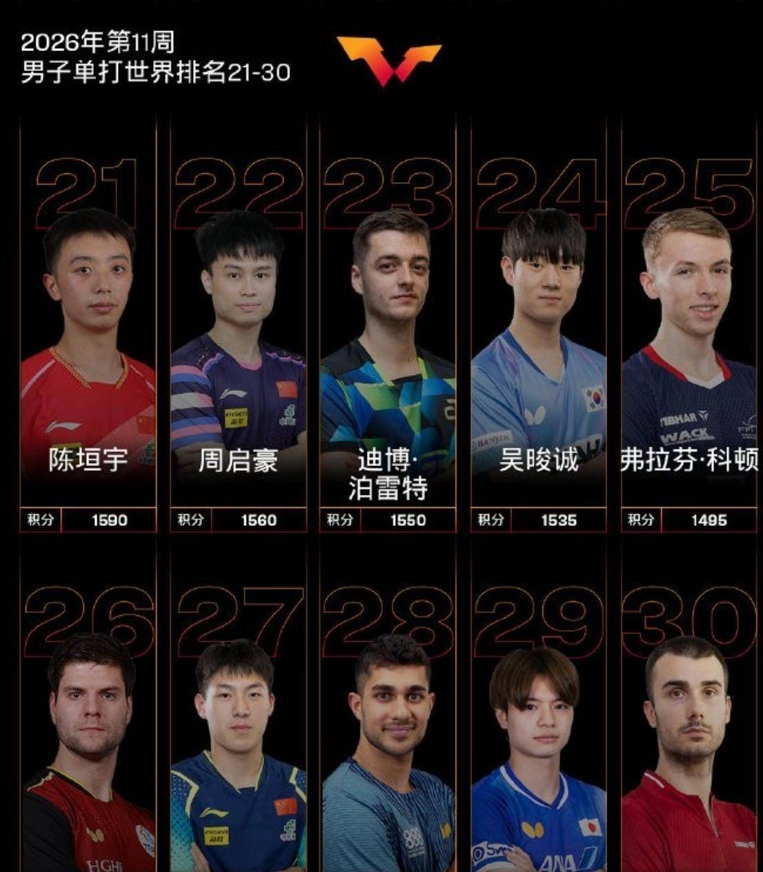 巴西的雨果虽然被陈垣宇拉下马,滑落至第四,但积分与林诗栋咬得极紧。 日本的张本智和位列第五,法国的费利克斯·勒布伦第六,中国台北的林昀儒第七,日本的松岛辉空第八,韩国的张禹珍第十。 世界前十的席位,被七个不同协会的选手瓜分,竞争空前开放。